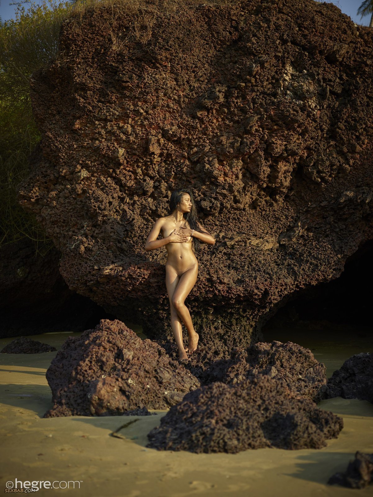 Описание: Расположившись рядом со скалами на пляже, смуглая и полностью голая девушка с влажными длинными волосами начинает красиво позировать и грациозно прогибаться. Наслаждаясь происходящим, молоденькая стройняшка подробно показала натуральные сиськи с немного набрякшими сосочками и бритую письку с попочкой, в процессе стараясь ставить руки на талию.